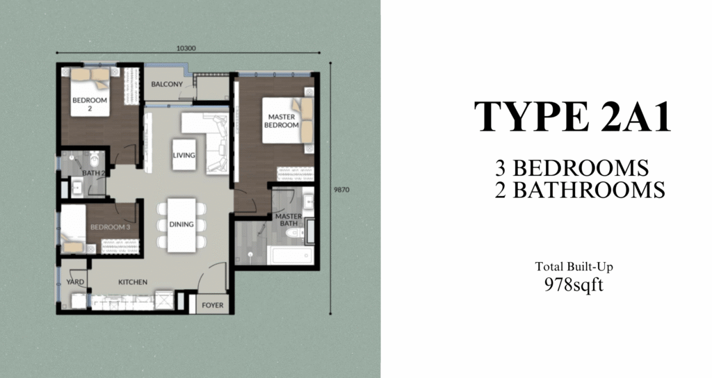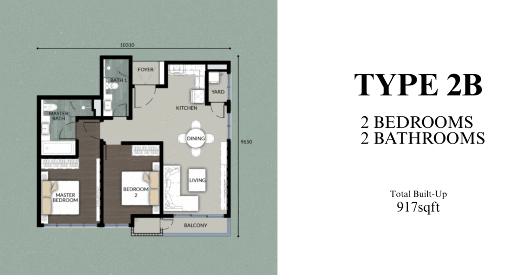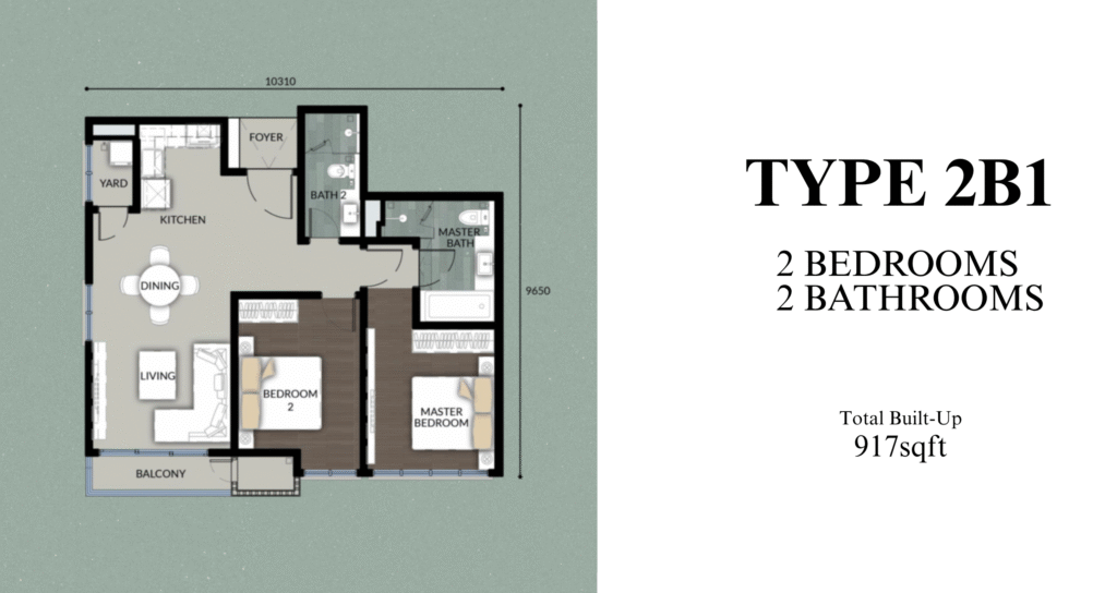 Serene environment with a pool, gym, yoga deck, and green community spaces.